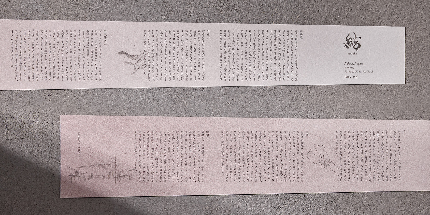 パッケージには絵巻ラベルを採用。取材に訪れた体験をもとに綴られた紀行文を記し、留シールは特殊印刷加工で高級感のある仕上がりに。